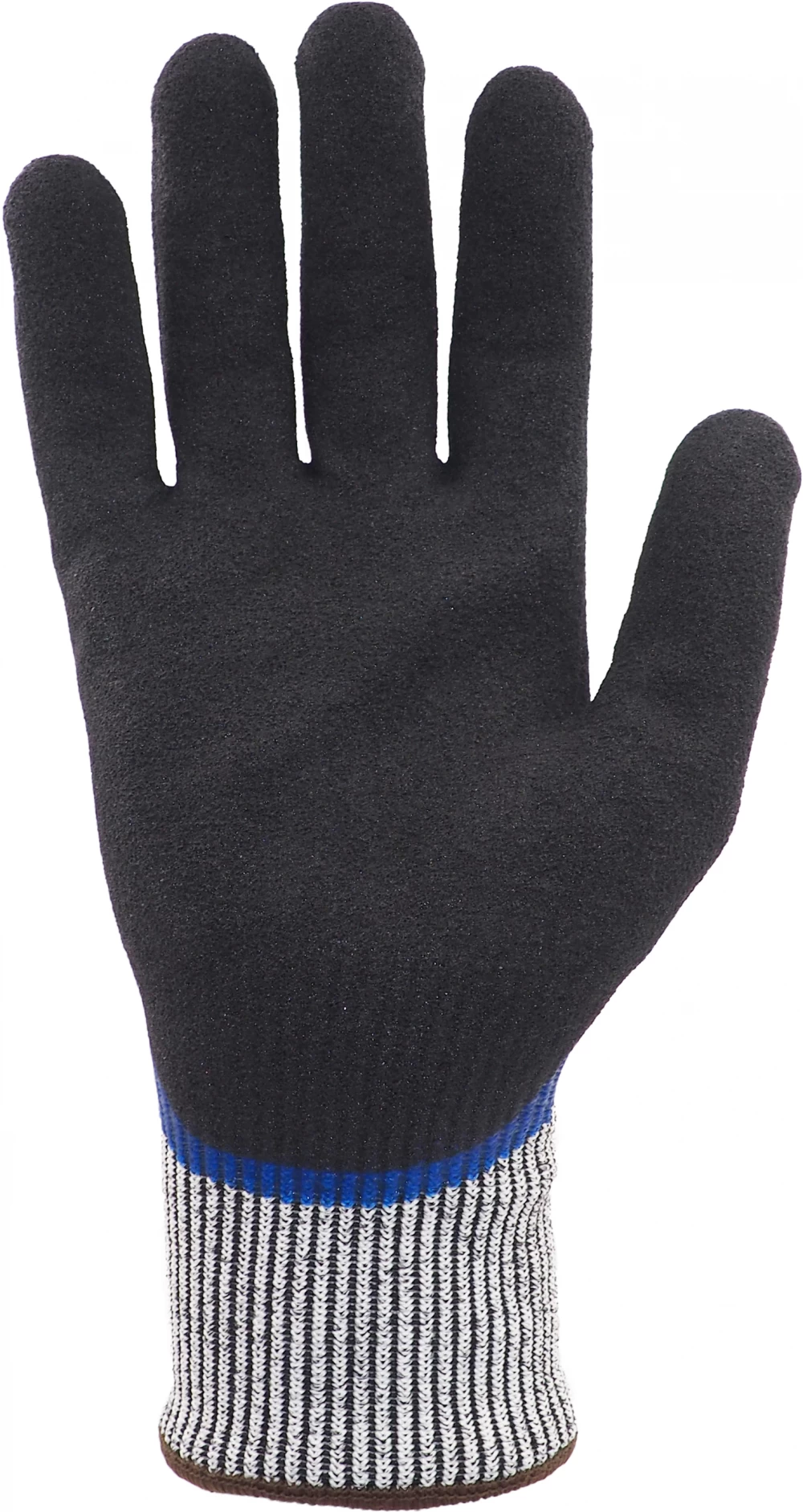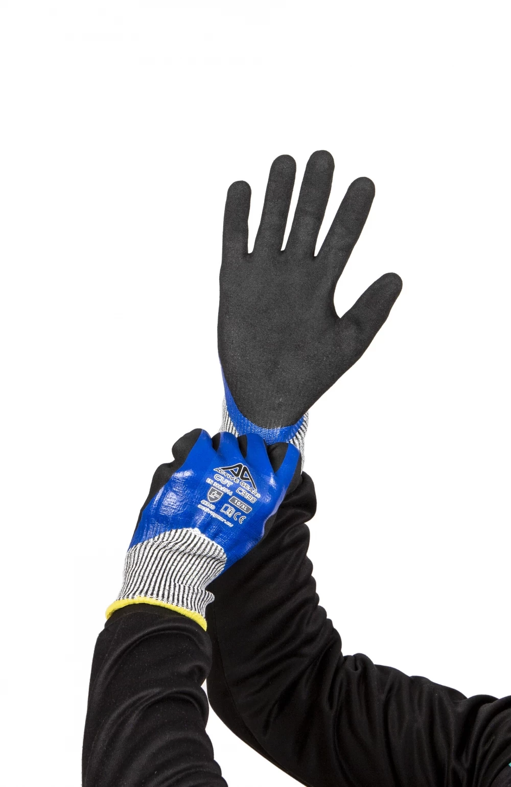 Robuste Schnittschutzhandschuhe mit einer doppelten Beschichtung aus glattem blauem Nitril und schwarzem Sandnitril, der sich hervorragend für den Einsatz in öligen Umgebungen eignet.