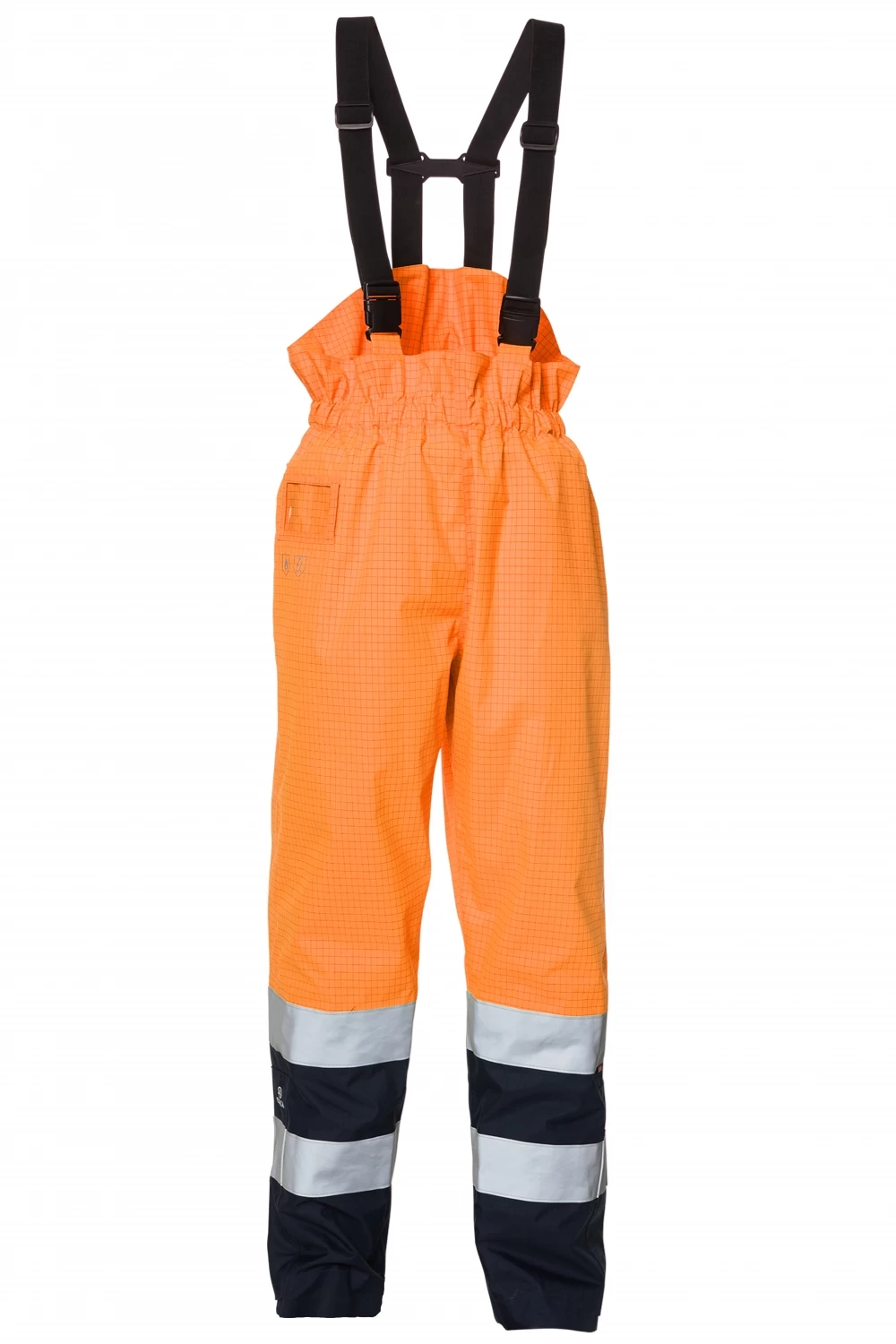 multinorm-Warnschutz-Latzhose besteht aus Oxford polyester 300D x 300D, 240g/m2; Verschweißte Nähte; die antistatische Warnschutz-Latzhose verfügt über feuerbeständige Reflexstreifen