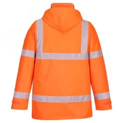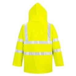 Nach Warnschutzkleidung Klasse 3 zertifizierte strapazierfähige Hi-Vis-Regenjacke. Zertifiziert nach EU-Norm EN 343 und damit als Regenschutz gemäß EU-Richtlinie zugelassen. Verschweißte Nähte. Reißverschluss mit Sturmleiste. Kapuze mit Kordel. Große Fronttaschen. An den Ärmeln und in der Taille verstellbar. Die Regenjacke ist in Größe L 80 cm lang.rnZertifizierte Regenkleidung gemäß EN 343.rnZertifizierte Warnschutzkleidung der Sichtbarkeitsklasse 3 gemäß EN ISO 20471. 100 % polyurethanbeschichtetes Polyestergewebe