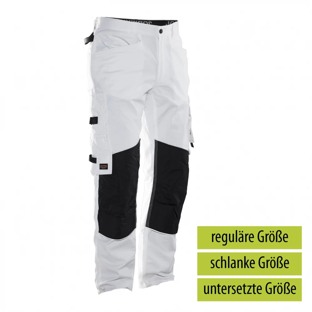 Malerhose mit hervorragendem Sitz und Design, speziell für professionelle Maler entwickelt. Der strapazierfähige, dichtgewobene Baumwoll-Twill von Jobman maximiert die schnelle Verteilung von Lösungsmitteln, um eine Absorption von Pigmenten zu minimieren. Geräumige Front- und Gesäßtaschen, Beintasche mit Zusatzfach und Reißverschluss, Taschen für Telefon und Ausweis. Tasche für Messer und Zollstock mit nützlichem Fach für alle Malerwerkzeuge. Die Hose hat eine Tuchhalterschlaufe. Waschbar bei 85 °C. Kniepolstertaschen aus robustem FA™-Polyamid mit zwei Positionen für Kniepolster. nZertifiziert nach EN 14404: 2004+A1:2010 Typ 2 Stufe 1 zusammen mit den Kniepolstern 9943, 9944 und 9945 von Jobman. 100 % Baumwolle