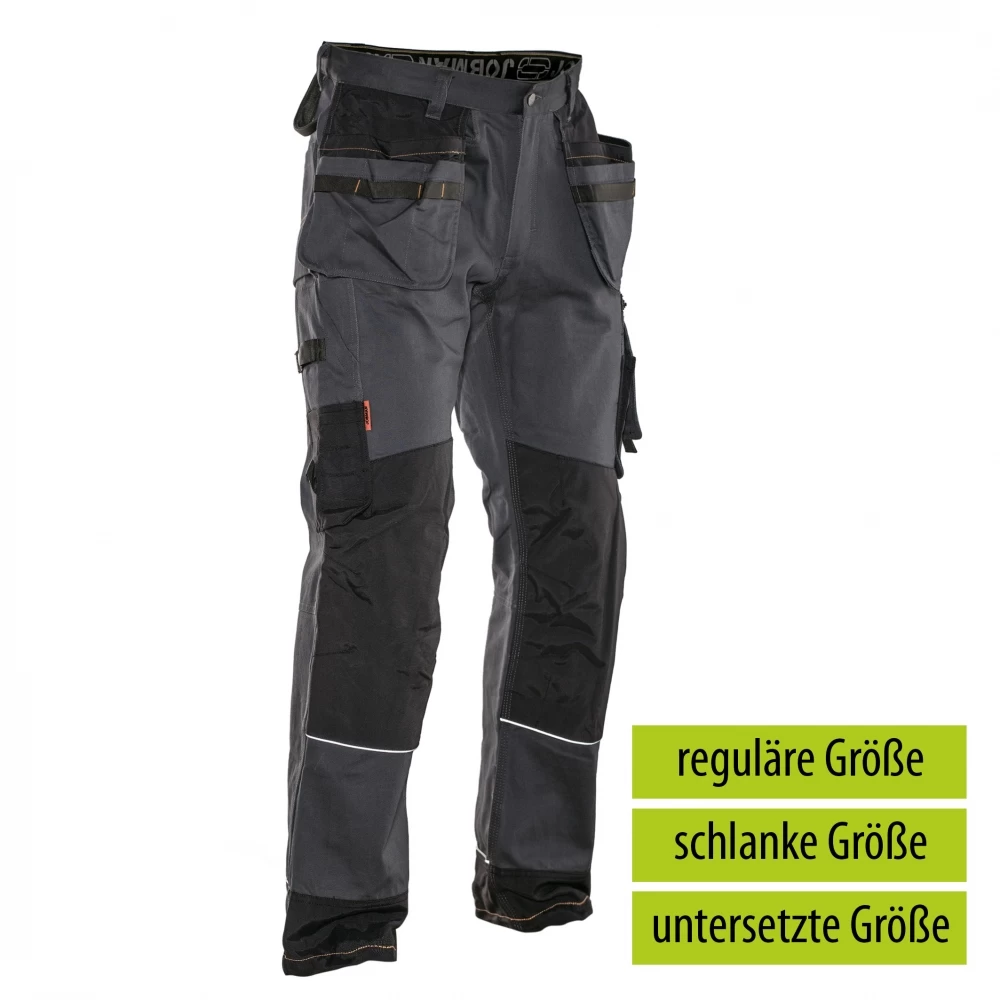 Extra verstärkte Partien wie Holstertasche, Gesäßtaschen und Zollstocktasche. Geräumige Holstertaschen, die sich in den Fronttaschen verstauen lassen. Geräumige Fronttaschen. Innen verstärkte Gesäßtaschen. Hammerschlaufe. Zusätzliche Gürtelschlaufen in den größten Größen. Zollstocktasche mit Messerknopf. Beintasche mit Reißverschluss, Telefon-, Ausweis- und Zusatztasche. Vorgeformte Knie für optimale Passform. Knietaschen aus strapazierfähigem Cordura® mit reflektierenden Paspeln und für Kniepolster in zwei Positionen verstellbar. Mit wasserabweisendem Polyamid verstärkte Beinabschlüsse. Reflektierende Paspeln und Tunnelzug am Beinabschluss. nZertifiziert nach EN 14404:2004+A1:2010 Typ 2 Stufe 1 zusammen mit den Kniepolstern 9943, 9944 und 9945 von Jobman. 100 % Baumwolle