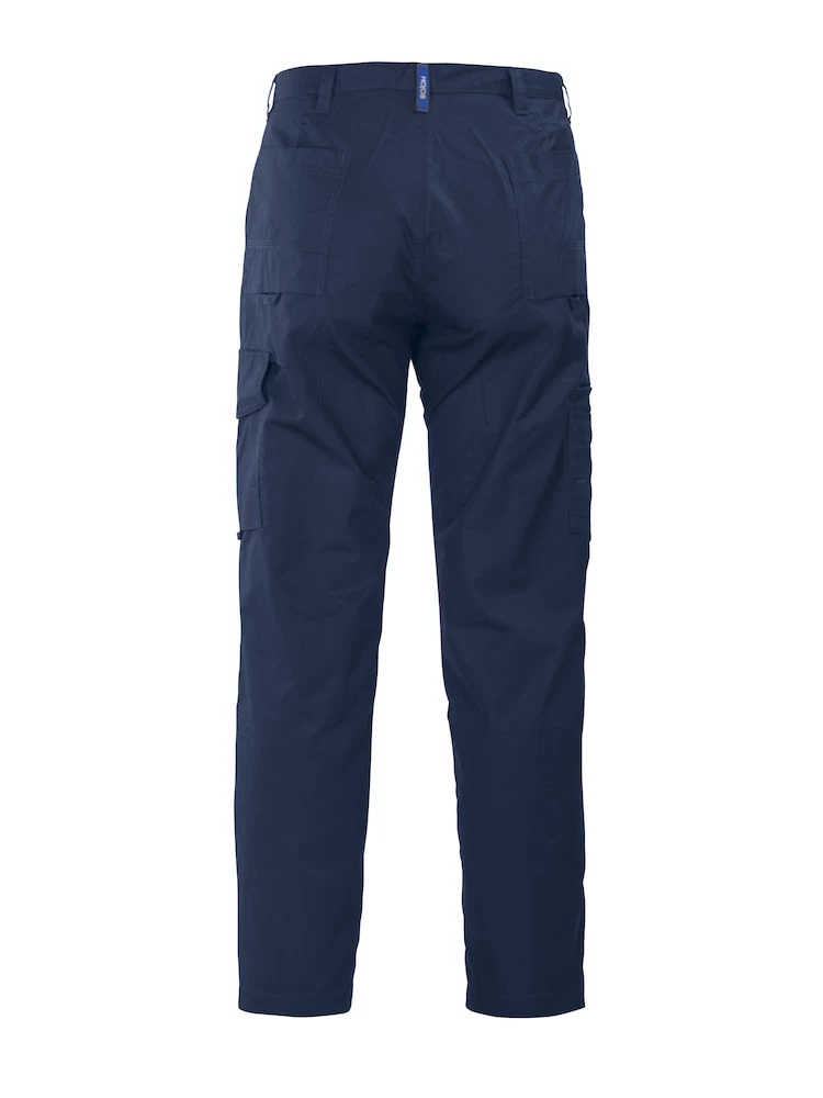 Arbeitshose ohne Bundfalten. Seitentaschen und Sicherheitstasche mit Reißverschluss auf der rechten Seite. Zwei aufgesetzte Gesäßtaschen. Zwei Beintaschen. Die linke Tasche mit Klappe und innen liegender Handy-Tasche. Die rechte Tasche bietet Platz für Mobiltelefon, Schreibgeräte, Dokumente und Zollstock. D-Ring für Schlüssel oder ID-Karte, etc.. Knieprotektortaschen mit Öffnungen auf der Innenseite des Hosenbeins. Schlaufen unter den Gesäß- und Beintaschen zur Befestigung von Inbags. 100% Baumwolle, 200 g/m²