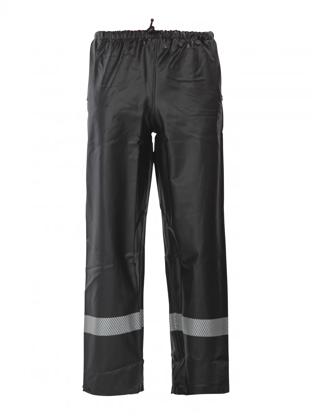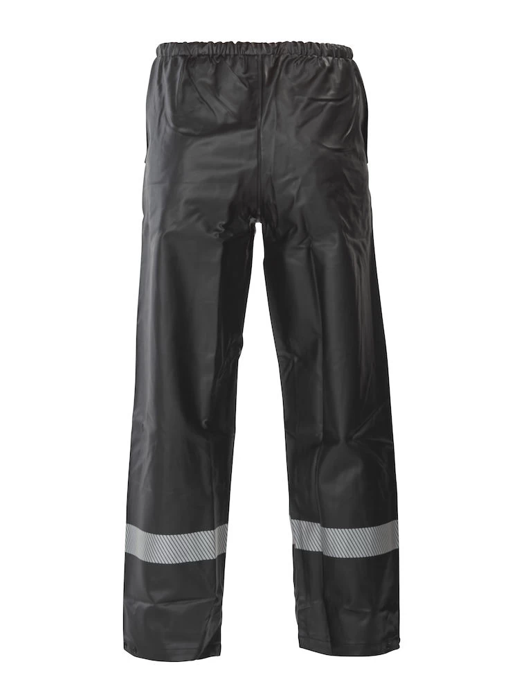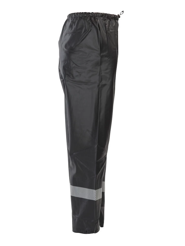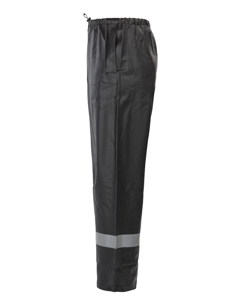 Regenhose mit verschweißten und abgedeckten Nähten. Elastischer Bund und Taschen mit Klappe. Belüftungsöffnungen und Reflektoren am Beinabschluss. 100% PVC