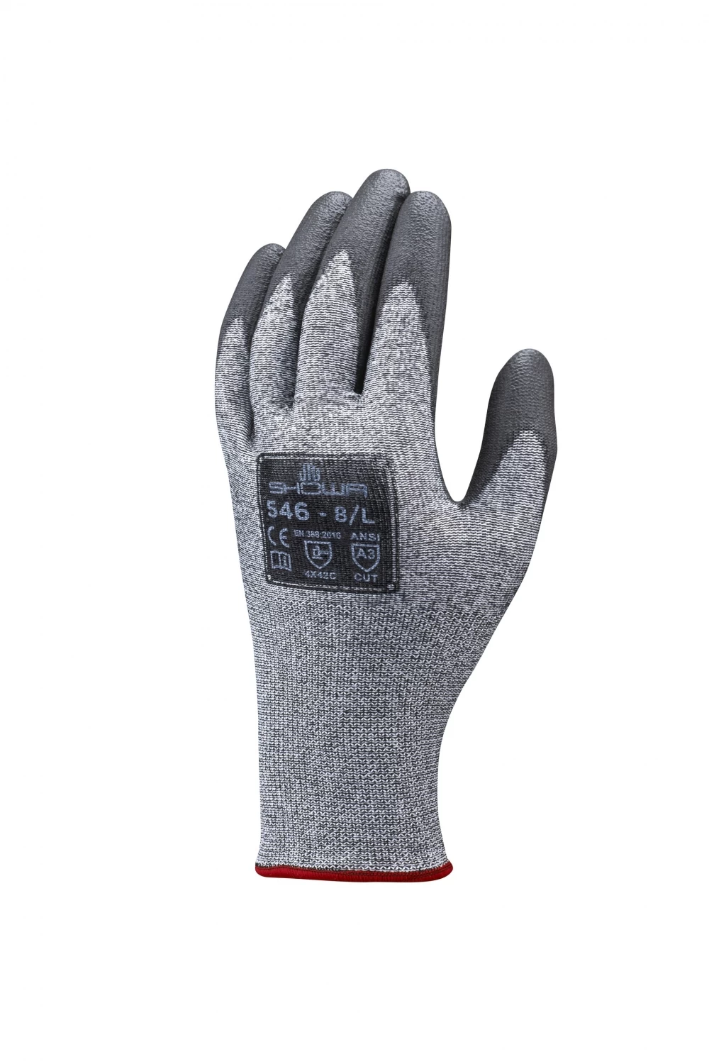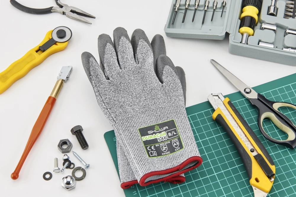 Die Schnittschutzhandschuhe SHOWA DURACOIL 546 aus DURACoil-Gewebe mit Beschichtung aus Polyurethanschaum bestehen aus HPPE.