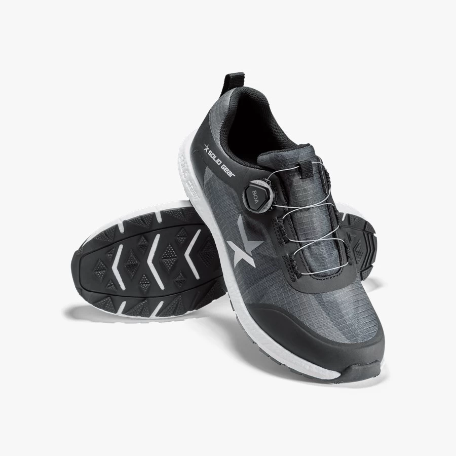 Der Solid Gear Dynamo ist eine einzigartige Kombination aus einem Schuh, der sowohl für den Trail als auch für das Laufen konzipiert wurde. Die komplette ETPU-Zwischensohle sorgt für optimalen Komfort und Rebound. Die Stabilität kommt aus dem Charakter eines Trail-Schuhs, mit einer speziellen Board-Konstruktion für die Kontrolle der Biegung. Die Gummi-Außensohle wurde entwickelt, um überragenden Grip zu bieten, und trägt trotz des geringen Gewichts der Außensohle ebenfalls zur Stabilität bei. Das CORDURA® Ripstop-Obermaterial in Kombination mit dem BOA® Fit System sorgt für eine hervorragende Passform und ein gutes Gefühl. Dynamo verwendet die speziell entwickelte, hoch rückfedernde OrthoLite®-Einlegesohle, die hauptsächlich aus recycelten Materialien besteht. Antistatisch, ölbeständig und rutschhemmend sind die Eigenschaften der Gummilaufsohle, die es dem Solid Gear Dynamo ermöglicht, nach EN-20347:2012 zertifiziert zu werden.