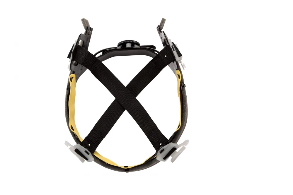 Sicherheitshelm weist ein stark abgewinkeltes Nackenband und einen Kinnriemenhalter für perfekten Sitz auf; der Schutzhelm verfügt über Regenrinne und seitliche Slots für Gehörschützer